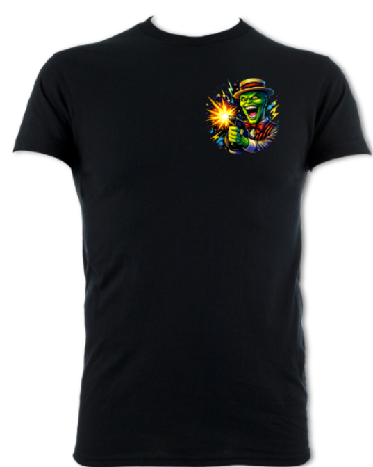 Sharper contrast. Harder edges. A comic-book gangster filtered through electric colour and lightning-bright violence. The grin isn’t playful anymore — it’s calculated.